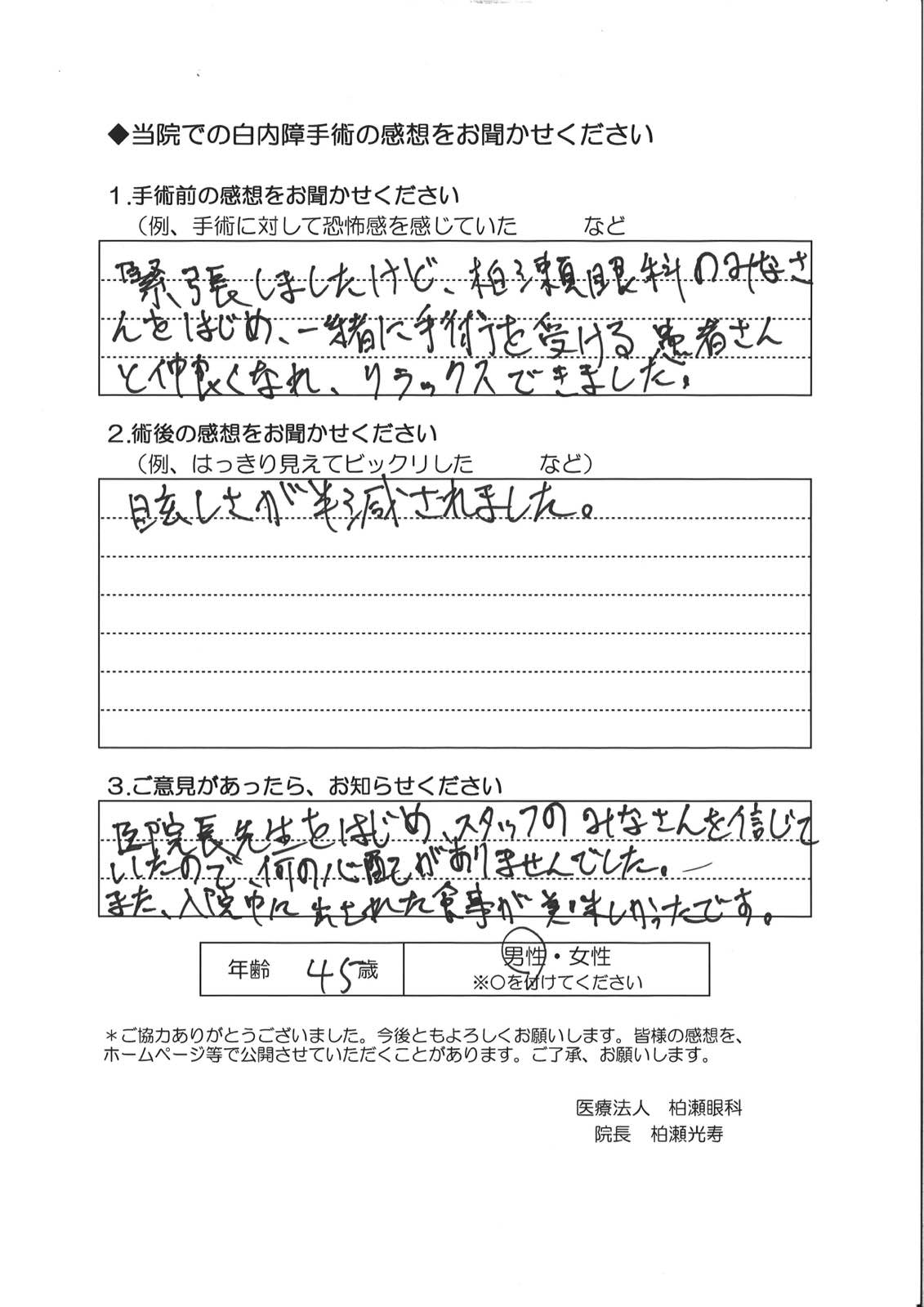 手術前の感想 緊張しましたけど、柏瀬眼科のみなさんをはじめ、一緒に手術を受ける患者さんと仲良くなれ、リラックスできました。 術後の感想 眩しさが半減されました。 ご意見 医院長先生をはじめ、スタッフのみなさんを信じていたので、何の心配がありませんでした。 また、入院中に出された食事が美味しかったです。 Post navigationNextNext post:49歳 男性