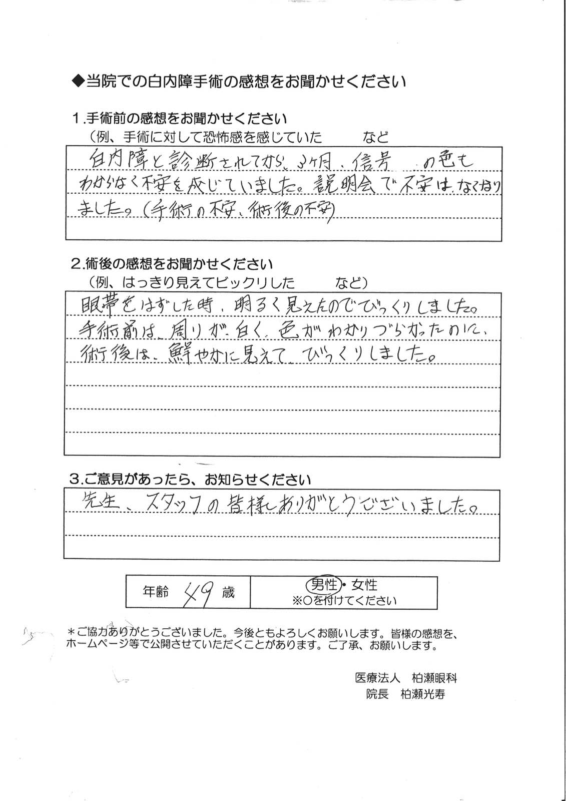 手術前の感想 白内障と診断されてから、3カ月、信号の色もわからなく不安を感じました。説明会で不安はなくなりました。(手術の不安、術後の不安) 術後の感想 眼帯をはずした時、明るく見えたのでびっくりしました。手術前は、周りが白く、色がわかりづらかったのに、術後は、鮮やかに見えて、びっくりしました。 ご意見 先生、スタッフの皆様ありがとうございました。 Post navigationPreviousPrevious post:45歳 男性NextNext post:59歳 女性