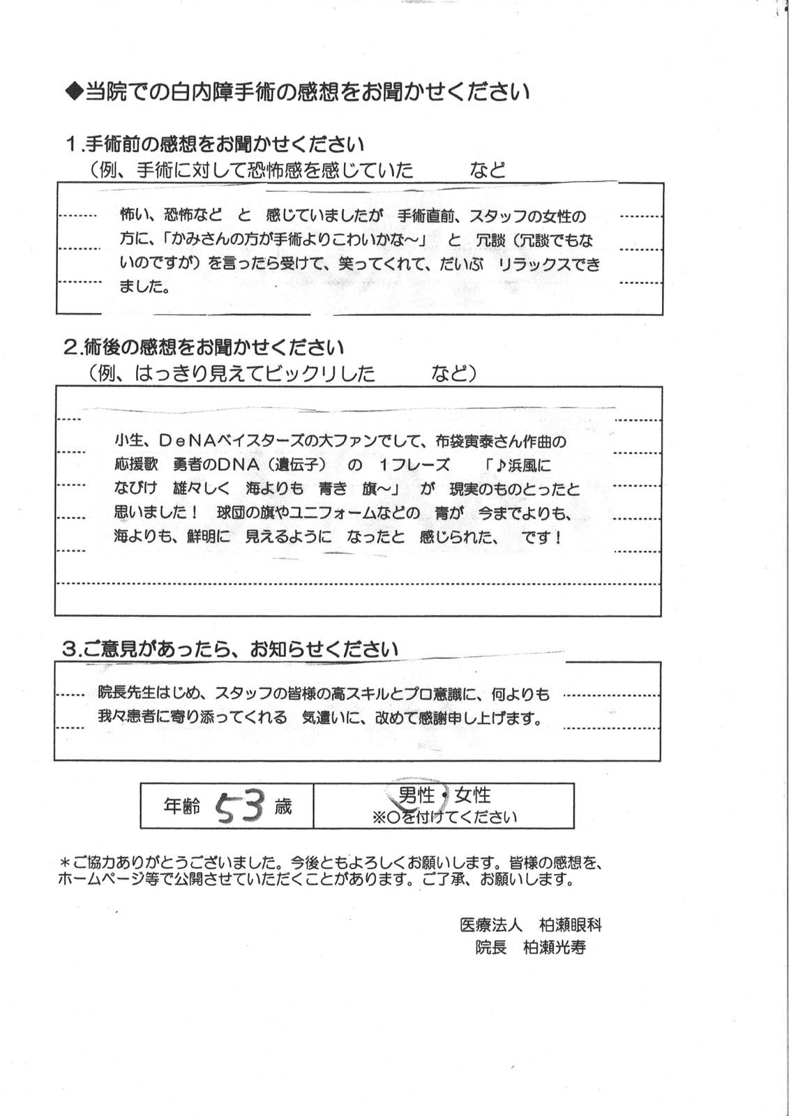 怖い、恐怖などと感じていましたが手術直前、スタッフの女性性の方に、「かみさんのほうが手術よりこわいかな~」と冗談(冗談でもないのですが)を言ったら受けて、笑ってくれて、だいぶリラックスできました。