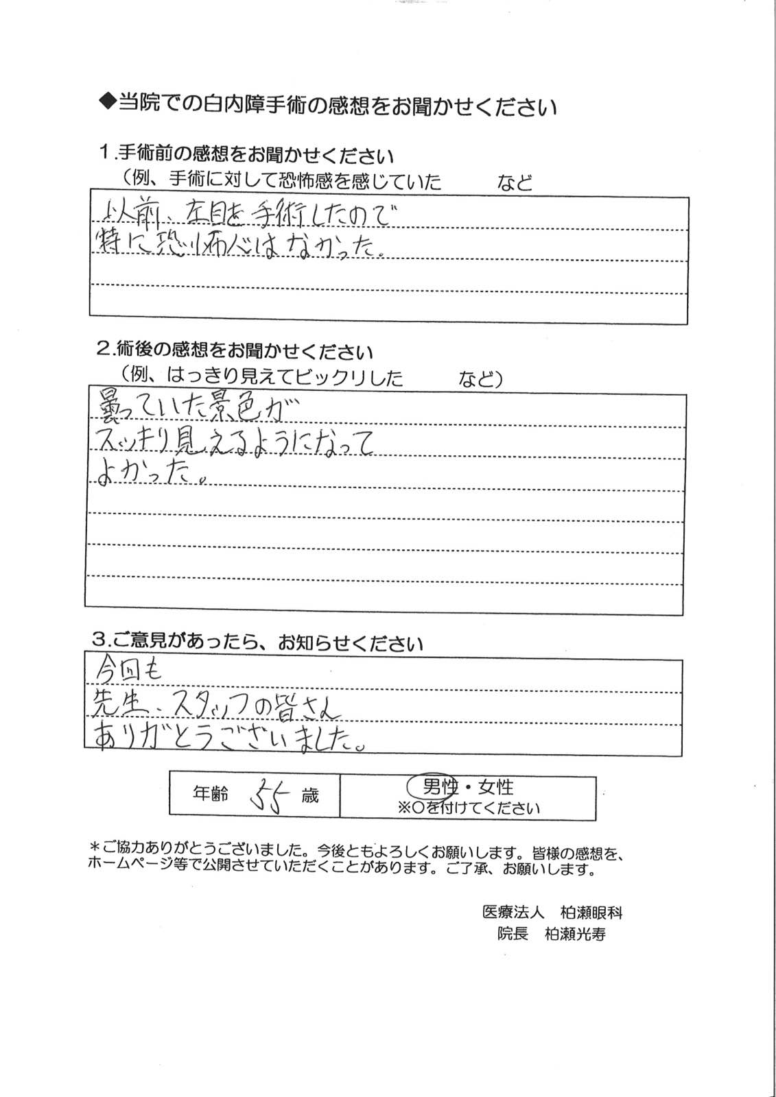 手術前の感想 以前、左目を手術したので特に恐怖心はなかった。 術後の感想 曇っていた景色がスッキリ見えるようになってよかった。 ご意見 今回も先生、スタッフの皆さんありがとうございました。 Post navigationPreviousPrevious post:57歳 男性NextNext post:69歳 男性