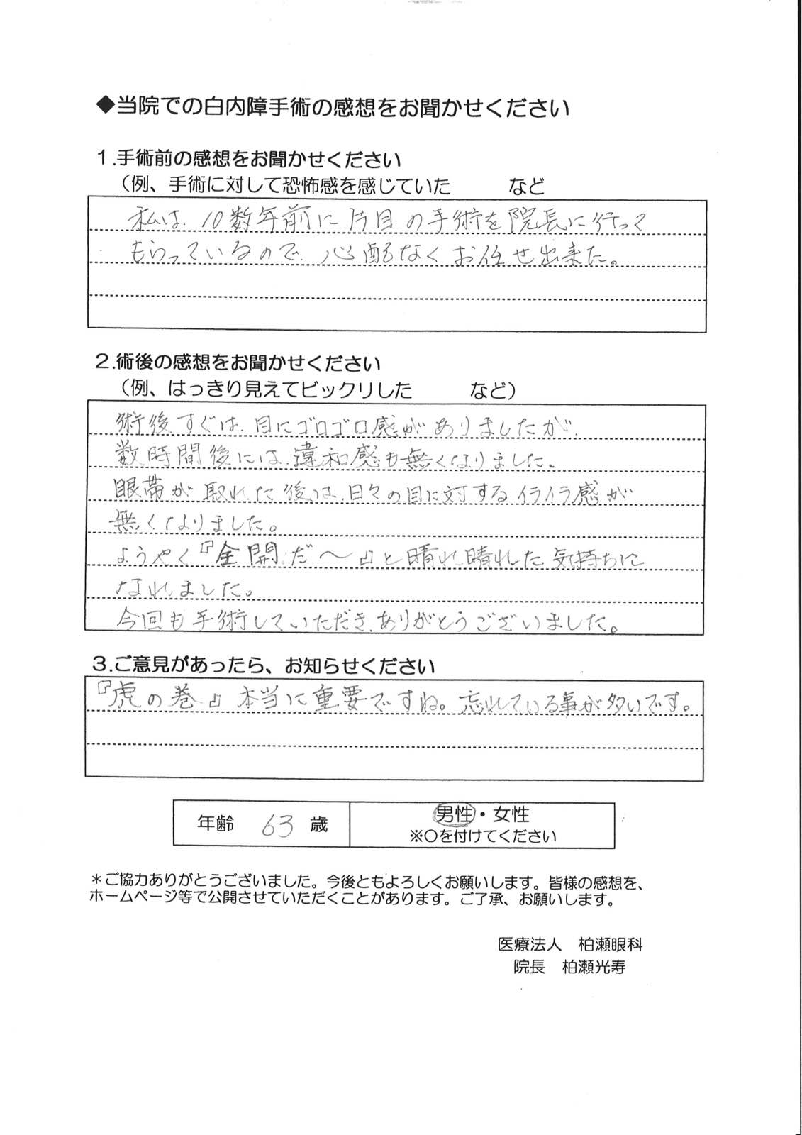 手術前の感想 私は、10数年前に片目の手術を院長に行ってもらっているので、、心配なくお任せ出来た。 術後の感想 術後すぐは、眼にゴロゴロ感がありましたが、数時間後には違和感も無くなりました。 眼帯が取れた後は、日々の目に対するイライラ感がなくなりました。 ようやく『全快だ~』と晴れ晴れした気持ちになれました。 今回も手術して頂き、ありがとうございました。 ご意見 『虎の巻』本当に重要ですね。忘れている事が多いです。 Post navigationPreviousPrevious post:66歳 男性NextNext post:69歳 女性