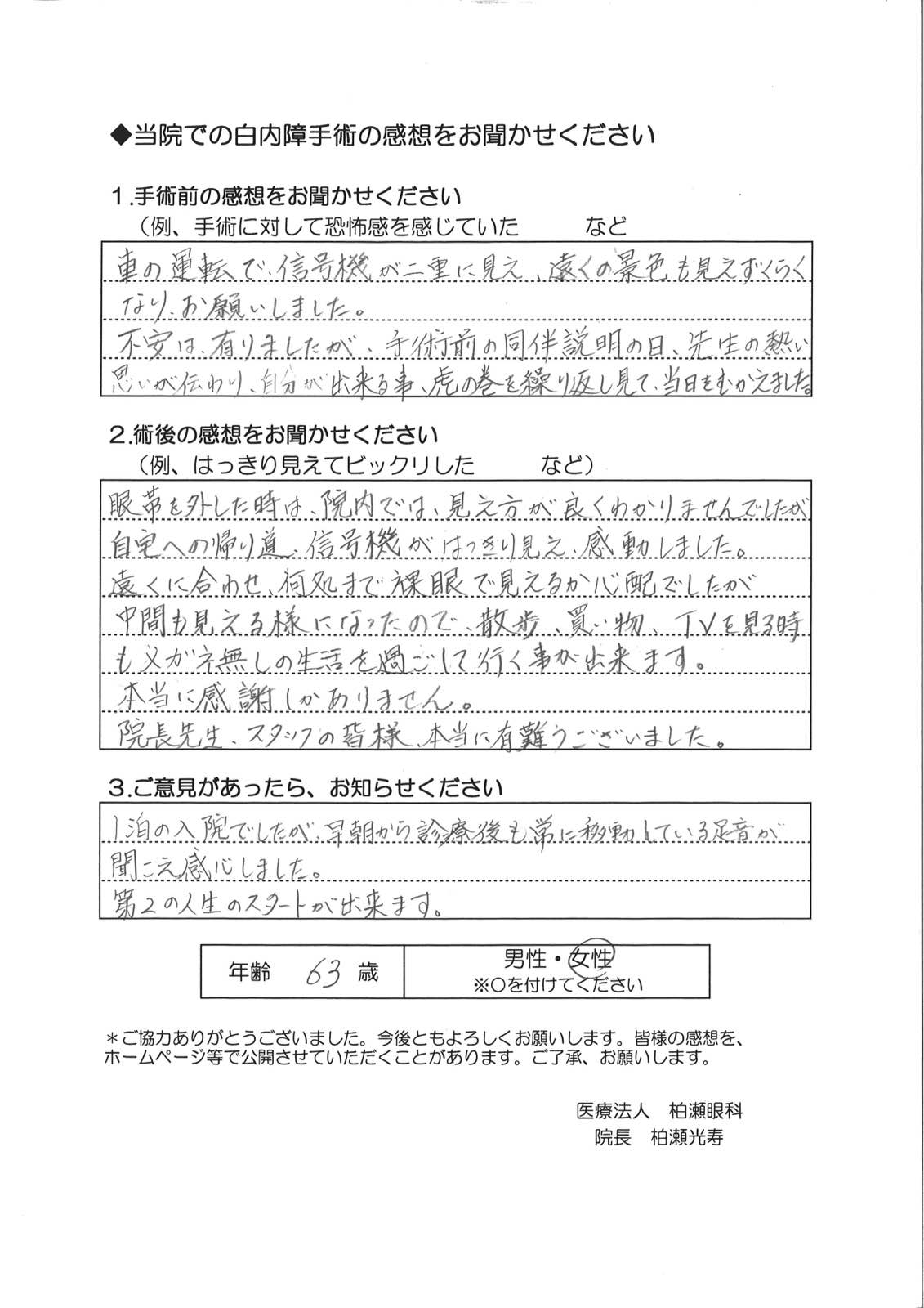 車の運転で、信号機が二重に見え、遠くの景色も見えずらくなり、お願いしました。不安は、有りましたが手術前の同伴説明の日、先生の熱い思いが伝わり、自分が出来る事、虎の巻を繰り返し見て、当日をむかえました。