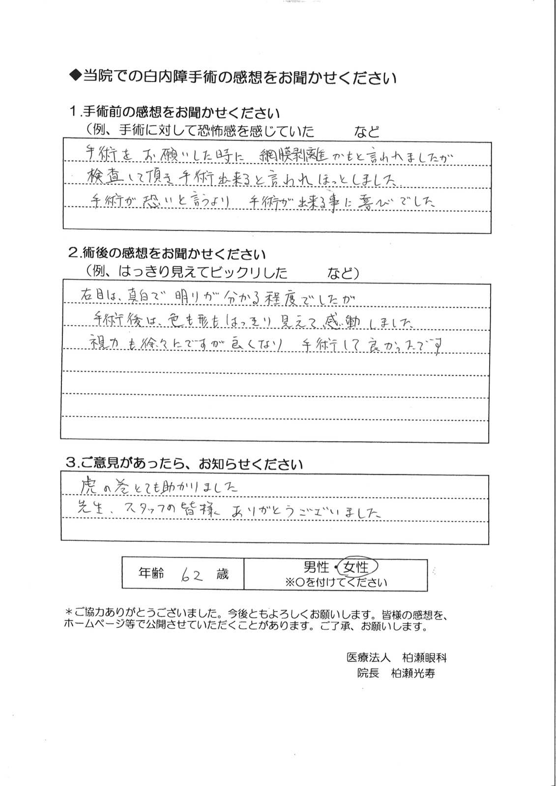 手術前の感想 手術をお願いした時に、網膜剥離かもといわれましたが、検査して頂き手術出来ると言われほっとしました。 手術が怖いというより、手術が出来る事に喜びでした。 術後の感想 右目は真白で明かりが分かる程度でしたが、手術後は、色も形もはっきり見えて感動しました。 視力も徐々にですが良くなり、手術して良かったです。 ご意見 虎の巻とても助かりました。 先生、スタッフの皆様、ありがとうございました。 Post navigationPreviousPrevious post:63歳 女性NextNext post:61歳 女性