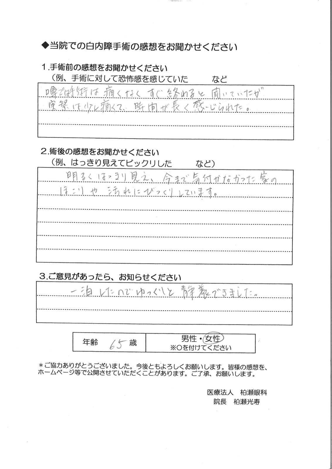 手術前の感想 噂では手術は痛くなくすぐ終わると聞いていたが、実際には少し痛くて、時間が長く感じられた。 術後の感想 明るくはっきり見え、今まで気付かなかった家のほこりや汚れにびっくりしています。 ご意見 1泊したのでゆっくりと静養出来ました。 Post navigationPreviousPrevious post:61歳 女性NextNext post:67歳 女性