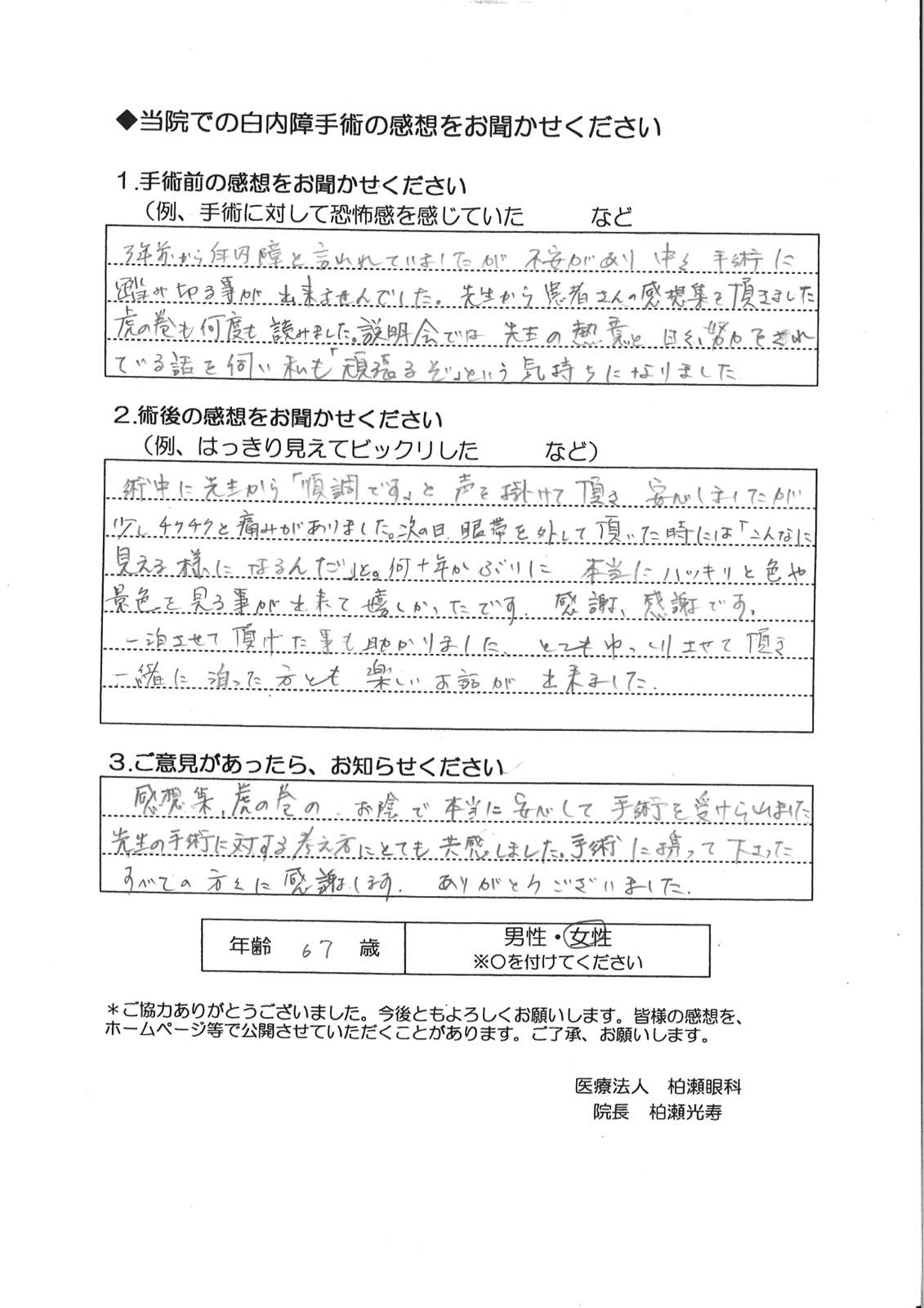 術中に先生から「順調です」と声をかけて頂き、安心しましたが、少しチクチクと痛みがありました。次の日、眼帯を外して頂いた時には「こんなに見える様になるんだ」と。何十年かぶりに本当にハッキリと色や景色を見る事が出来て嬉しかったです。感謝、感謝です。
