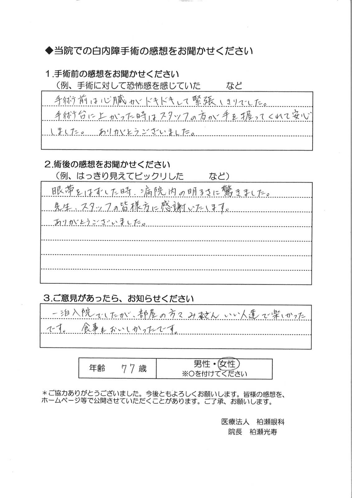 眼帯をはずした時、病院内の明るさに驚きました。先生、スタッフの皆様方に感謝いたします。ありがとうございました。