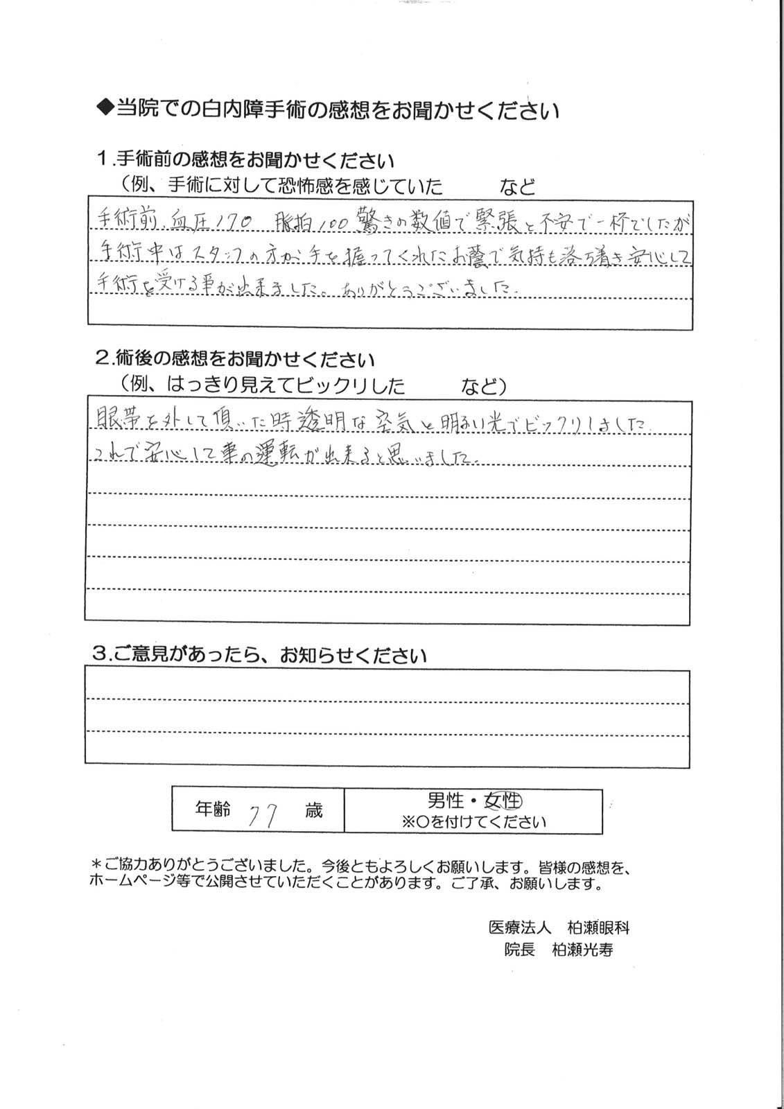眼帯を外して頂いた時透明な空気と明るい光でビックリしましたこれで安心して車の運転が出来ると思いました。