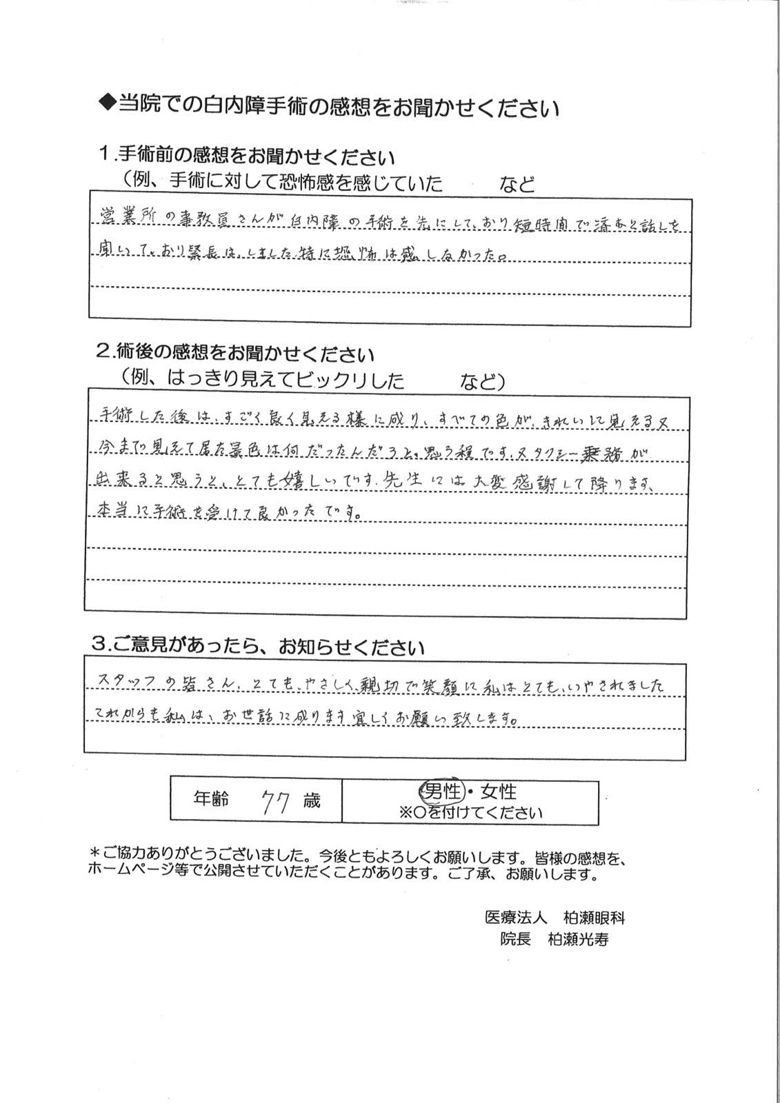 手術した後は、すごく良く見える様に成り、すべての色が、きれいにみえる又今まで見えて居た景色は何だったんだろうと、思う程です・又タクシー乗務が出来ると思うと、とても嬉しいです。先生には大変感謝して降ります。本当に手術を受けて良かったです。