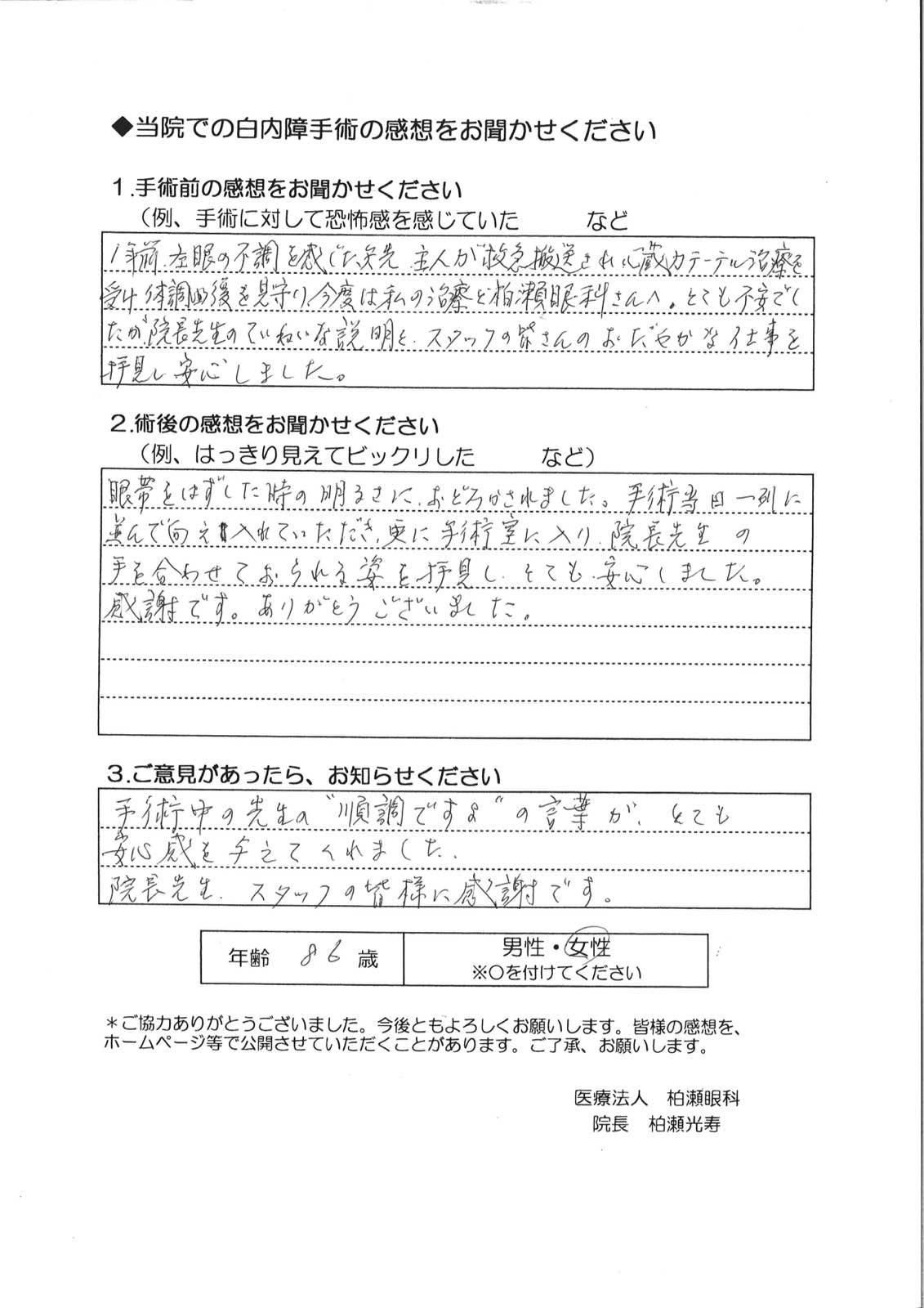 眼帯をはずした時の明るさに、おどろかされました。手術当日一列に並んで向え入れていただき、更に手術室に入り、院長先生の手を合わせておられる姿を拝見し、とても、安心しました。感謝です。ありがとうございました。