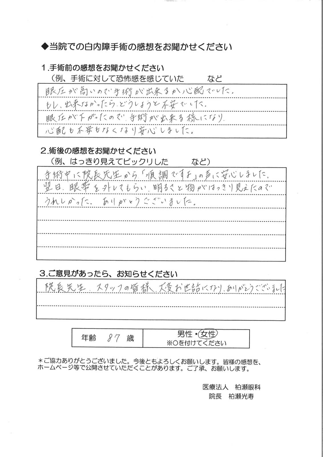 翌日、眼帯を外してもらい、明るさと物がはっきり見えたのでうれしかった。ありがとうございました。